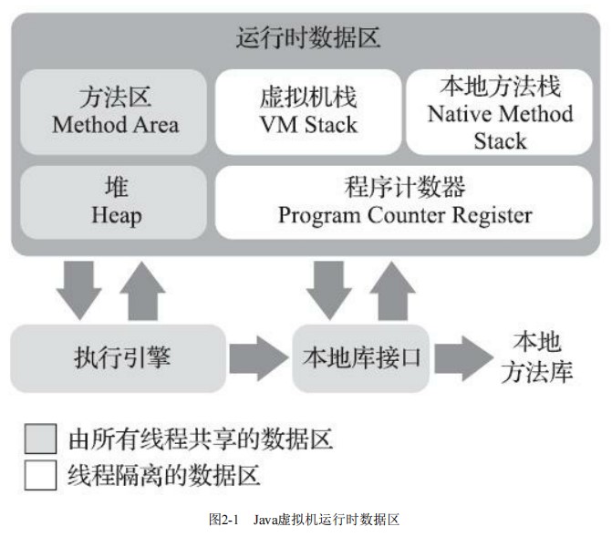 Java虚拟机在执行Java程序的过程中会把它所管理的内存划分为若干个不同的数据区域。这些区域 有各自的用途,以及创建和销毁的时间,有的区域随着虚拟机进程的启动而一直存在,有些区域则是 依赖用户线程的启动和结束而建立和销毁。根据《Java虚拟机规范》的规定,Java虚拟机所管理的内存 将会包括以下几个运行时数据区域,如图所示。![]()