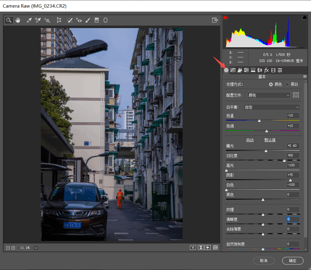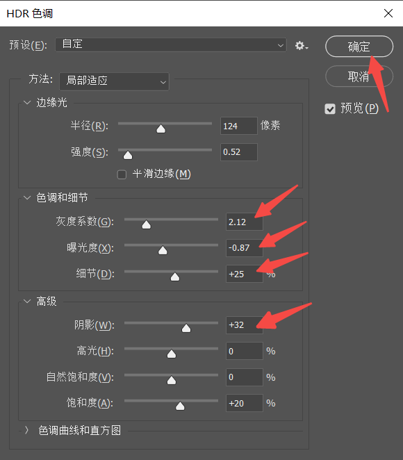 增加灰度系数,减小曝光度,增加细节,适量提高阴影,点击确定。