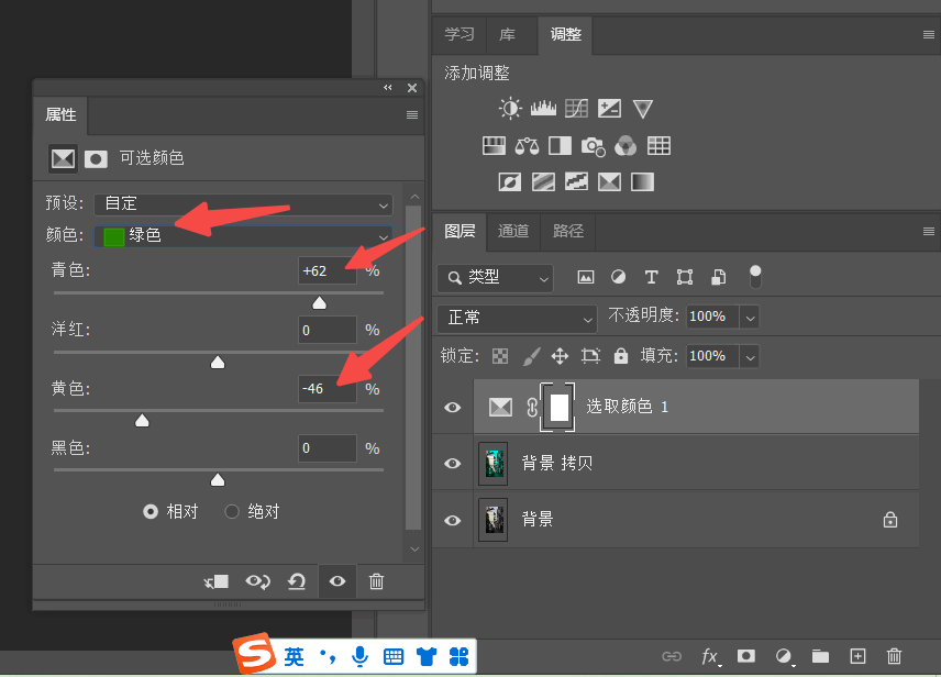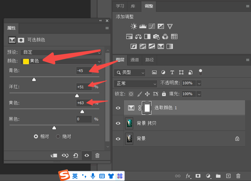 颜色选黄色,在黄色里加黄,加洋红,减青。
