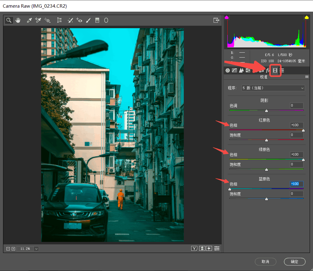 选择校准栏,红颜色、绿蓝色色相向右拉到头,蓝颜色色相向左拉到头,点击确定。