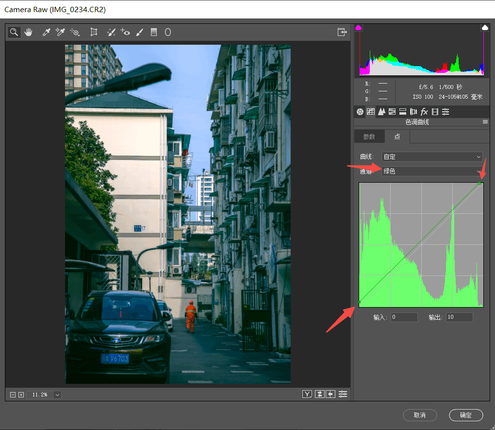 选择绿色通道,暗位往上拉加绿,高光往左拉稍加洋红。
