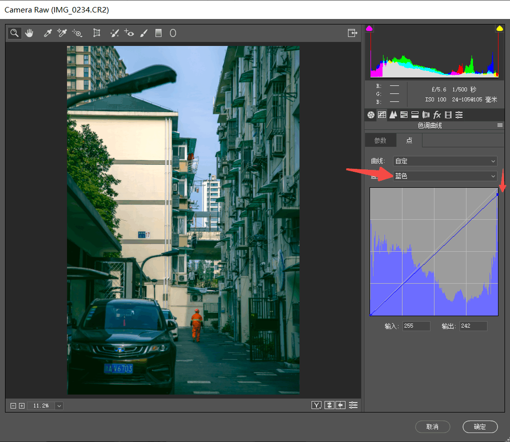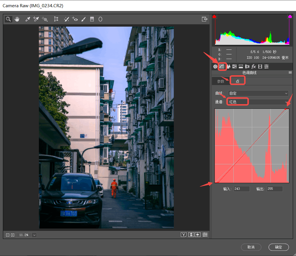 打开调色曲线,选择红色通道,暗位往右拉加青,高光往左拉加红。